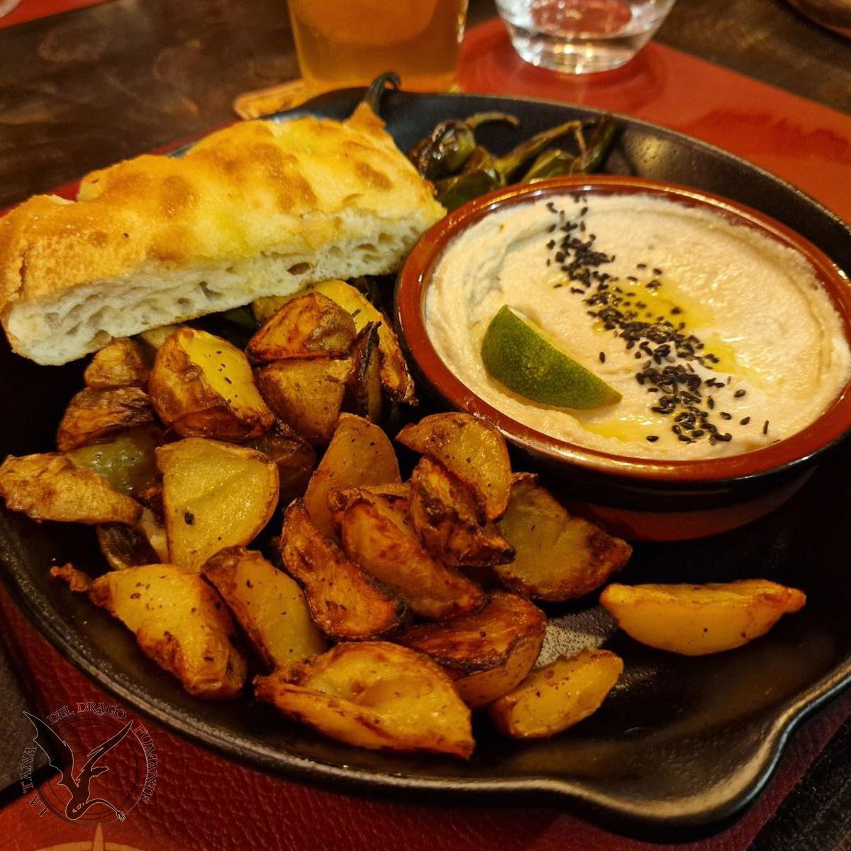Hummus e semi di papavero, servito con friggitelli e patate arrosto Tana-Made™ speziate alla paprika dolce |