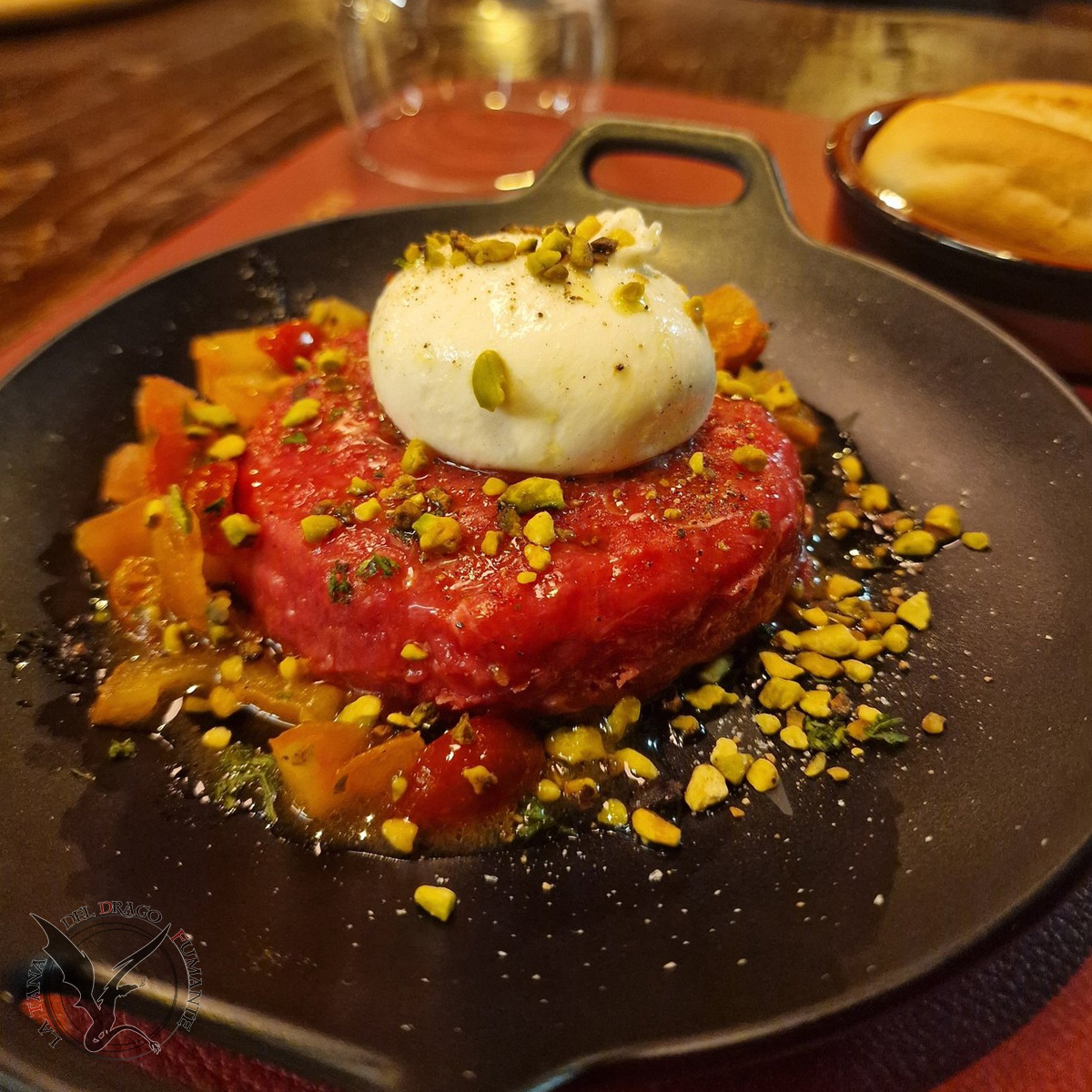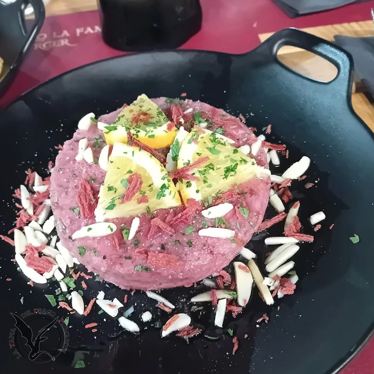 La leggenda narra che Il Fauno fosse una creatura dal gusto sopraffino... e dall'autocontrollo inesistente. Ogni equinozio banchettava nei boschi incantanti ovvero lì nel campo delle Terre di Mezzana, ma non toccava carne: pretendeva solo pietanze "degne di un semidio col piede caprino, boa dè!", come soleva dire. Un giorno, stanco delle solite radici e bacche tristi, si imbattè in un'elfa cuoca DeeDee Galadbirrin che stava mescolando un cremoso hummus tempestato di semi di papavero. Il Fauno, curioso come sempre, infilò lo zoccolo nella ciotola per assaggiare. L'elfa, esasperata, glielo ritirò subito con una padellata, bestemmiò gli antichi dei e lo corcò bene bene. Poi prese un birrone da litrone (tipica misura elfica) e se lo scolò come era solita fare. Guardò il Fauno (probabilmente di Livorno) e lo obbligò ad attendere il piatto completo: una caponatina profumata e patate arrosto Tana-Made™ speziate alla paprika dolce. Quando finalmente gli fu servito, il Fauno rimase muto. Per tre minuti interi. Poi dichiarò: "Questa è arte culinaria. Un lo sapevo mia che a Pisa si mangiava così bene! Giuro sulle mie corna che non scriverò più Pisa merda sulle cortecce degli alberi... almeno per oggi." Ed è così che nacque Il Fauno: un piatto tanto buono da domare persino il più irrequieto degli spiriti dei boschi.