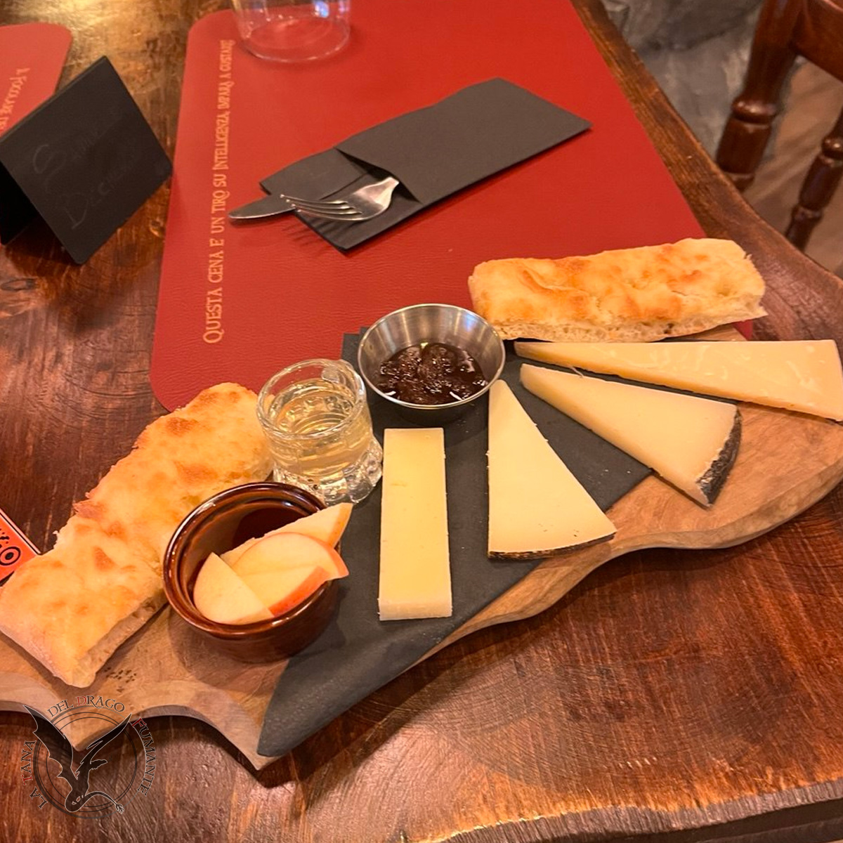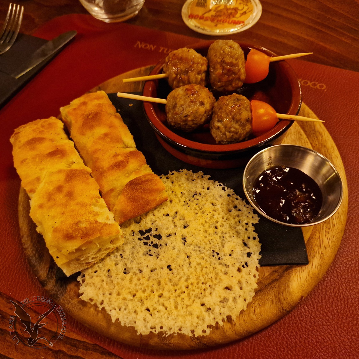 , cialda croccante di Grana Padano D.O.P., servite con composta di cipolle